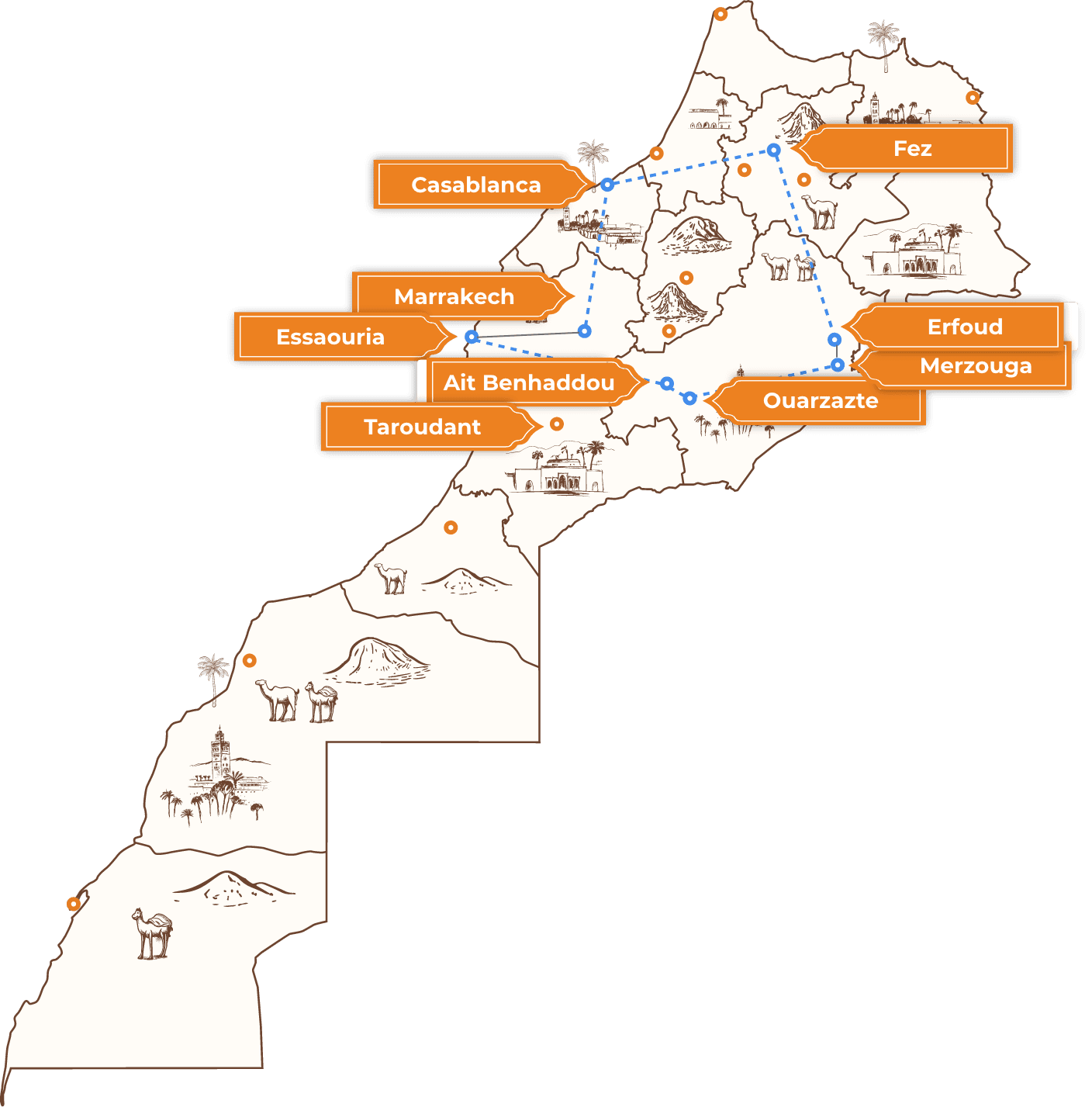 This Morocco tours ‘ itinerary showcases the exotic  trade capitals and staging posts along the trade routes of the old trans-Sahara merchant camel caravans as they made their way between through Western African to Europe and the East carrying gold, spices, salt and other exotic riches. Explore the souks and markets of Marrakech, Fez and, follow the trade routes through Morocco’s Sahara Desert staying overnight in a deluxe desert camp in the heart of the Soaring Erg Chebbi sand dunes. Enjoy this Morocco tours ‘ itinerary by choosing to join one of our deluxe Cultural Experience group tours of Morocco or choose to take this itinerary as a custom private tour of Morocco.